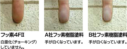 従来の塗料は年数が経過すると塗膜の表層樹脂が劣化し、粉状になって現れます(チョーキング)。フッ素4FIIは、指で触っても白くなりにくい(チョーキングが起こりにくい)塗料です。
